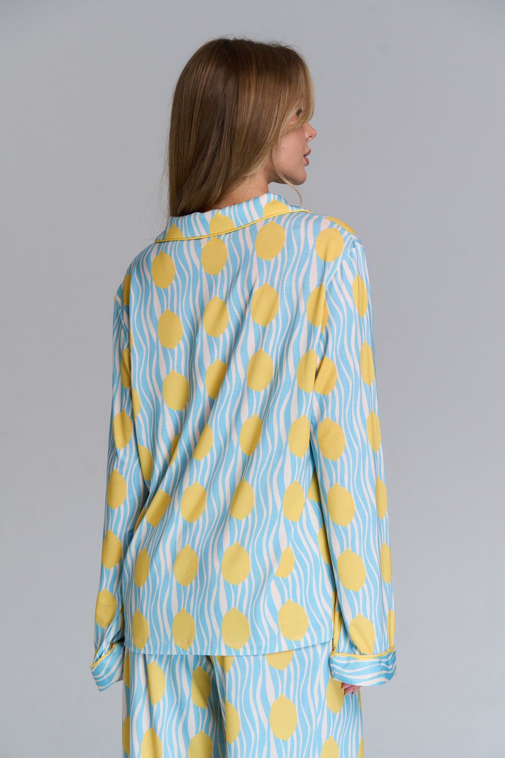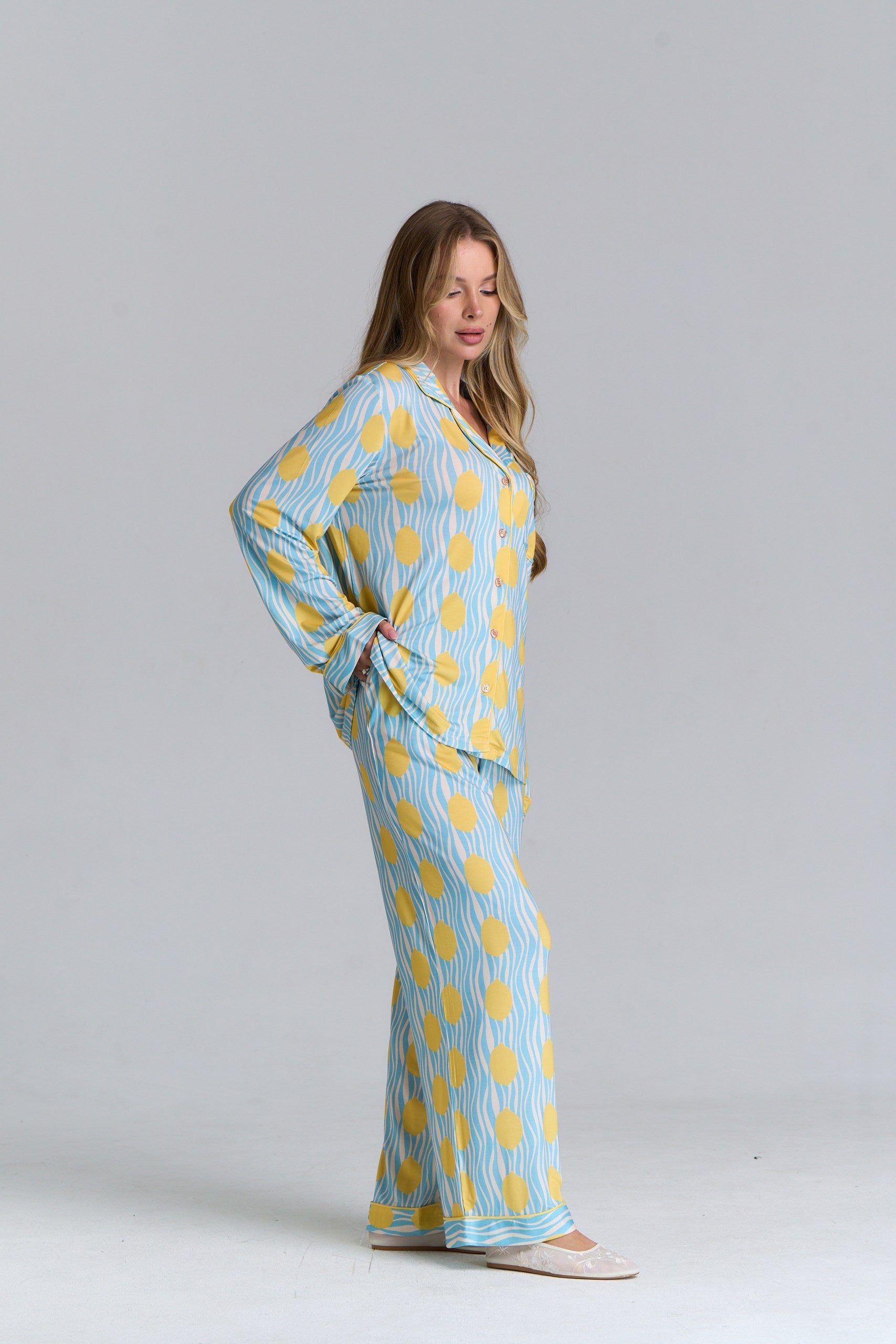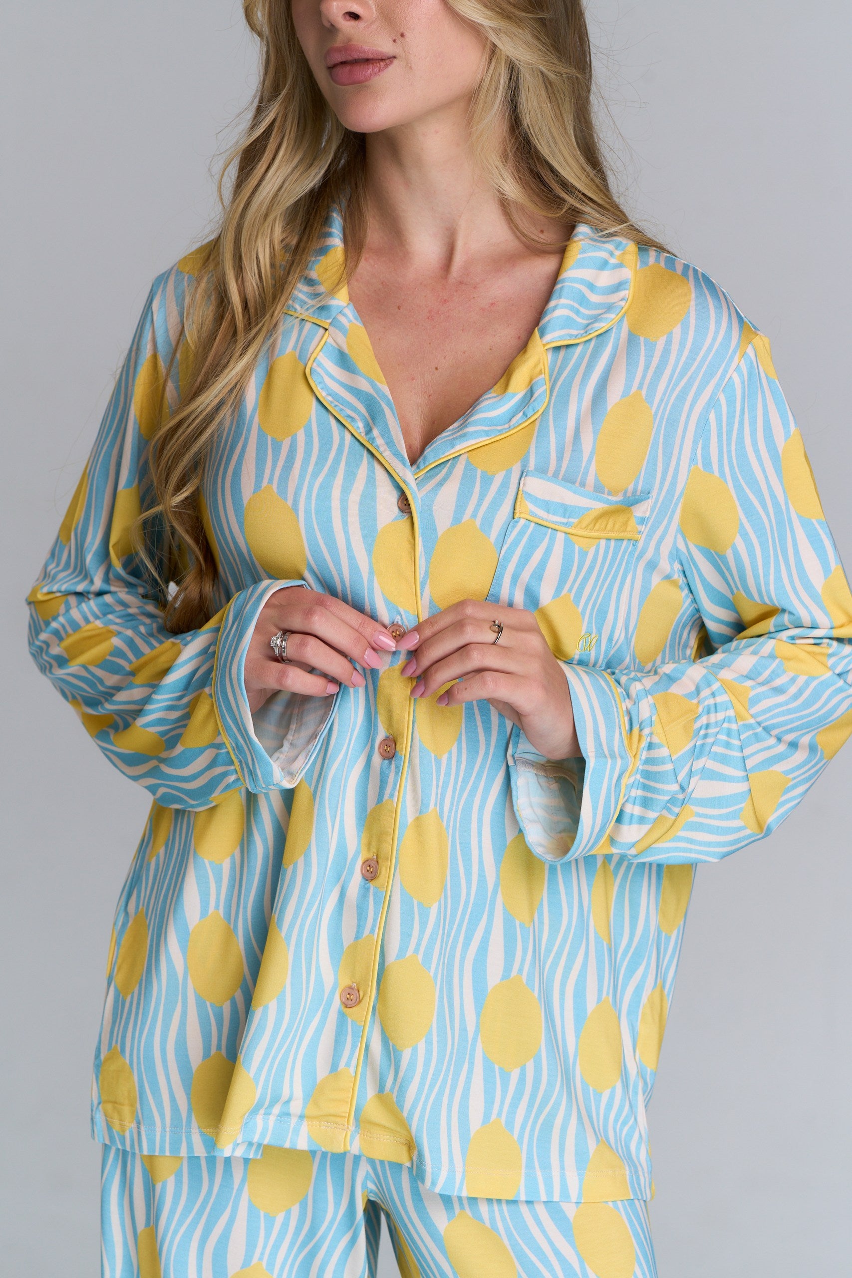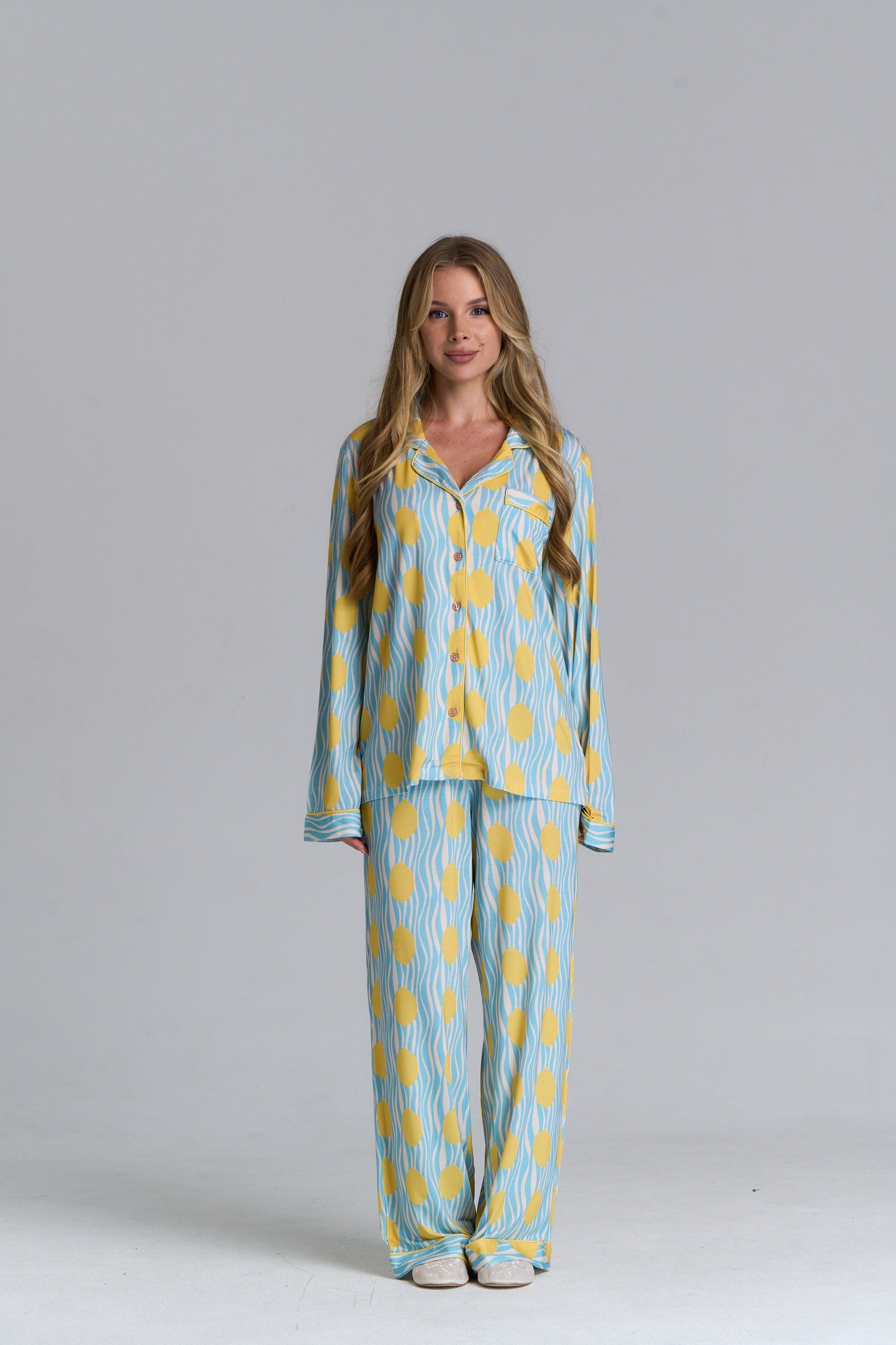 Add a splash of sunshine to your lounge days with our The Citrina pajama set. Featuring zesty lemon prints and playful blue squiggles, this set is crafted from premium bamboo viscose — soft, breathable, and made for effortless comfort with a citrusy twist.