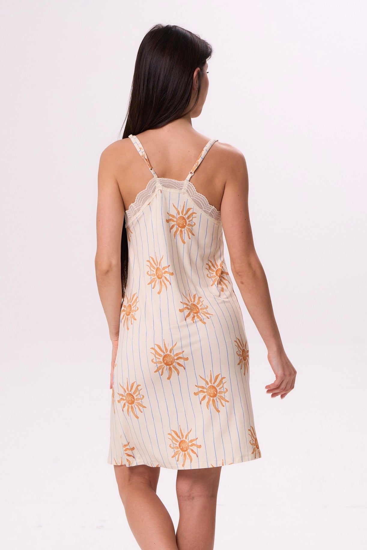 A sunshine-soaked slip dress kissed with delicate lace trim. Wrapped in golden suns and soft blue stripes, Sol brings a warm coastal glow to your everyday comfort. Crafted from premium bamboo viscose, it feels cool, breathable, and buttery-smooth against the skin.